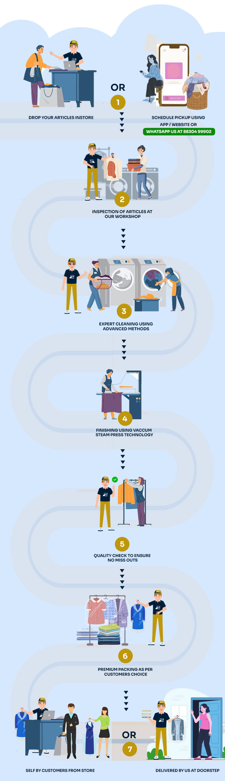 The prices mentioned on the price list are minimum starting prices, the actual cost of processing the articles / clothes depends on the number of clothes, as well as the type and complexity of garments and fabrics. We determine the dry-cleaning prices for different items based on the complexity of cleaning, the quality of fabric, and the level of care required. We use professional equipment and eco-friendly products to ensure the best results for your clothes. You can find the starting / indicative price list for different items on our app / weblink or website.