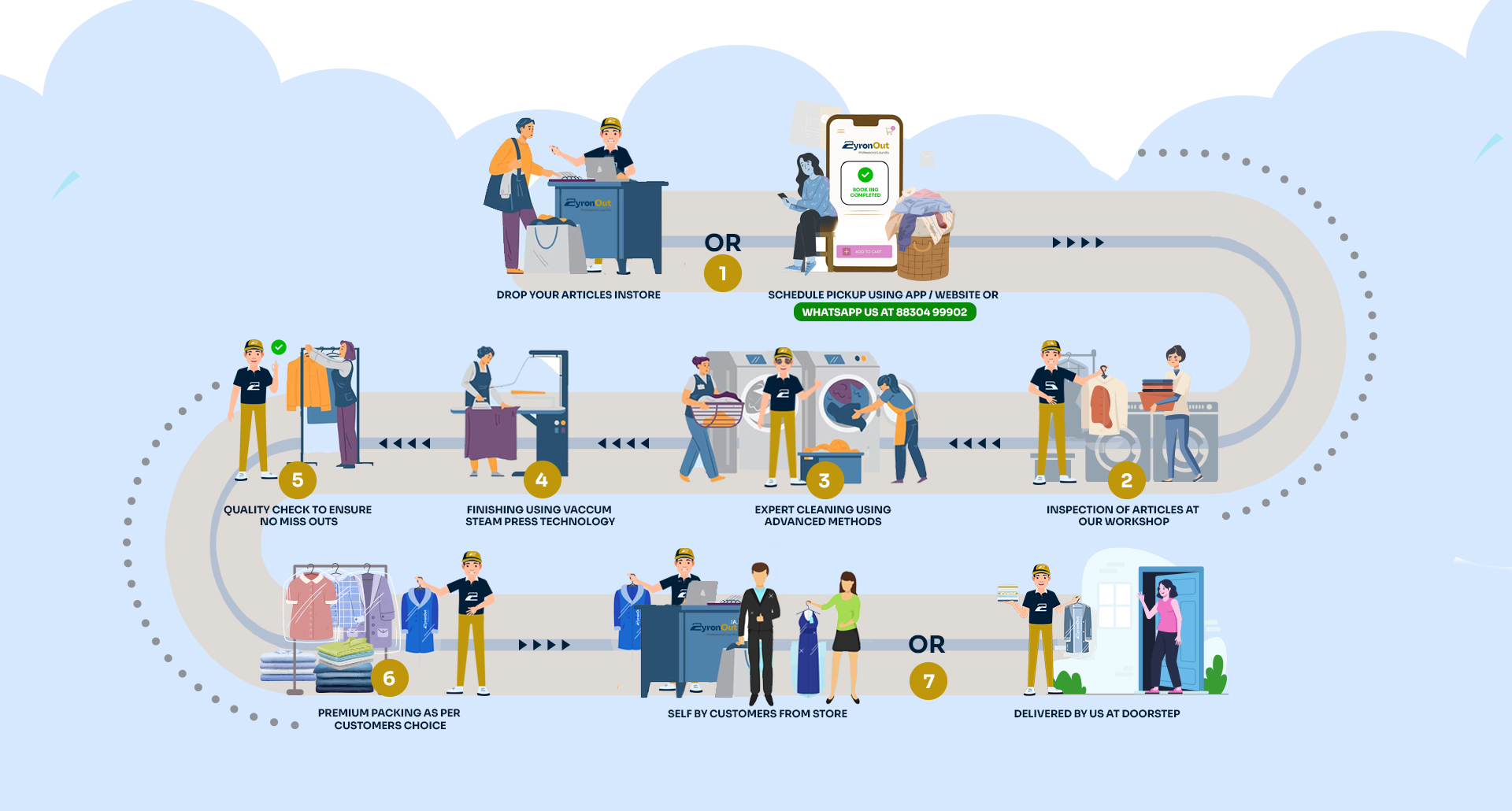 ZyronOut is a leading premium laundry brand, offering a wide range of high-quality laundry services through its in-house workshop. Utilizing modern, eco-friendly cleaning methods, we ensure that every garment is treated with the utmost care and precision. Our commitment to sustainability and advanced cleaning technology sets us apart as a top-tier laundry service provider in the region.